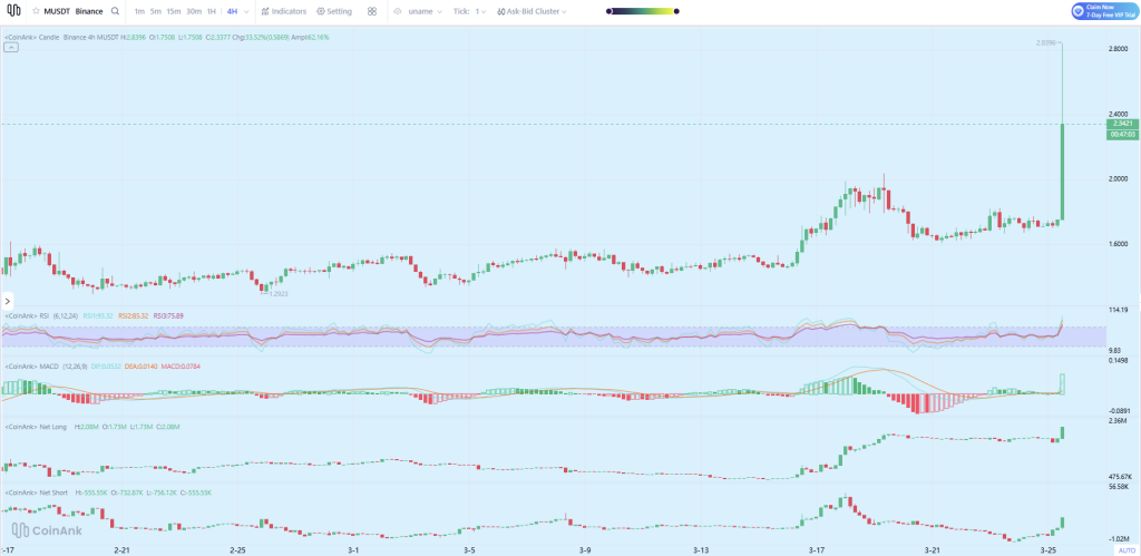 所示图表显示$M在币安的强劲上涨走势。在硬分叉公告前,价格多数时间徘徊于1.60美元附近。随后交易量激增,K线强势上行,推动价格突破2.34美元,当前K线显示强劲买压。