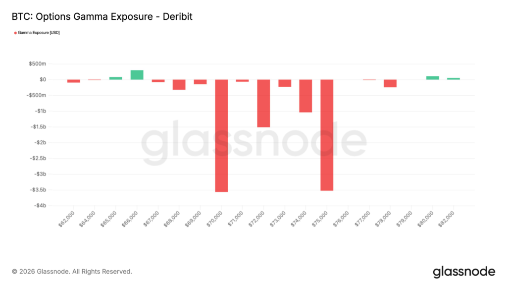 期权数据显示7万至7.5万美元区间存在显著的负伽马暴露,这意味着做市商的对冲操作将形成较强阻力。当伽马值为负时,价格波动往往被放大:上行过程中做市商通过逢高卖出对冲头寸,从而压制涨势;下跌时则可能因卖压加剧而加速滑落。