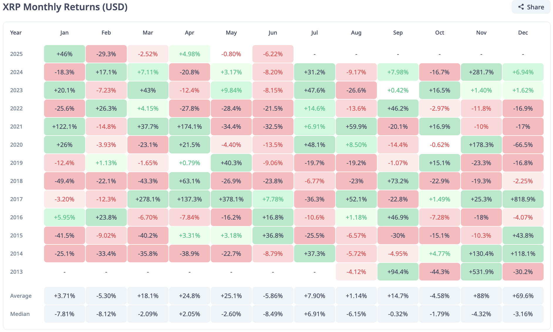 实际上,XRP的长期季节性特征表明,七月是其整个交易史上最闪耀的月份。除四月外,这是唯一平均月回报率和中位数月回报率均显著为正的月份,平均涨幅达7.90%,中位数回报率为6.91%。超过十年维持这种一致性绝非偶然,这暗示着市场运作机制中存在着某种固有模式,特别是在春季表现疲软之后。
