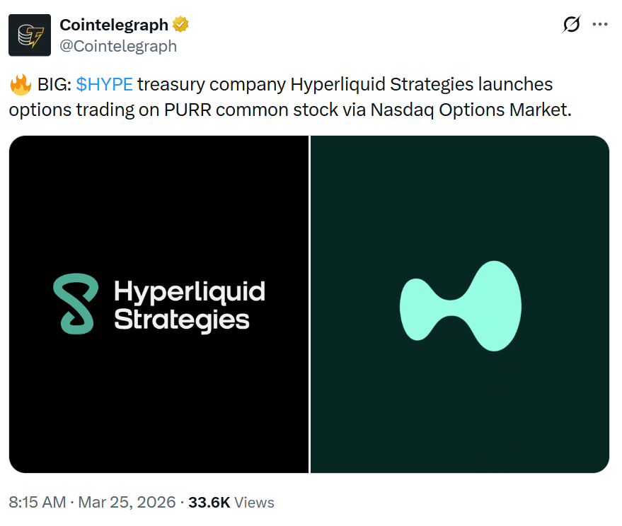 纳斯达克期权首秀为PURR提供了新的市场准入层次,并使Hyperliquid Strategies获得新的关注。它可能提升灵活性、可见度和交易兴趣。然而,真正的考验将来自实际合约活动,而非仅仅是上线本身。