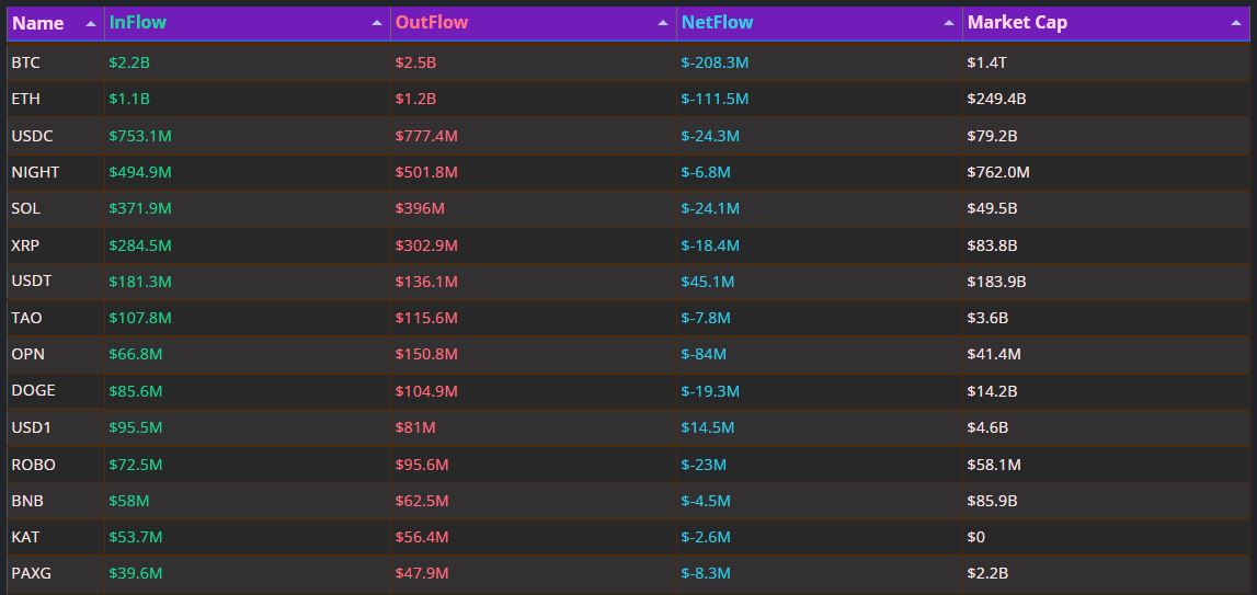 BTC单日流出2.83亿美元,ETH流出1.11亿美元占主导市值前十币种普遍呈现资金流出态势 数据显示,过去24小时内,比特币录得约2.038亿美元净流出,成为资金撤离规模最大的资产。以太坊同样呈现弱势,净流出额达1.115亿美元。 稳定币USDC亦出现2430万美元净流出,反映出避险资产内部也存在部分资金外流。此外,SOL与XRP分别产生2410万美元和1840万美元净流出,显示主要资产普遍延续保守态势。 资金流出集中于头部资产 在净流出榜单中,比特币与以太坊位居前列,分别以2.085亿美元和1.116亿美元的净流出规模,反映市场整体避险情绪。其后资产净流出额依次为8400万美元、2430万美元及2420万美元。资金撤离现象分散于各主要资产类别,表明 -