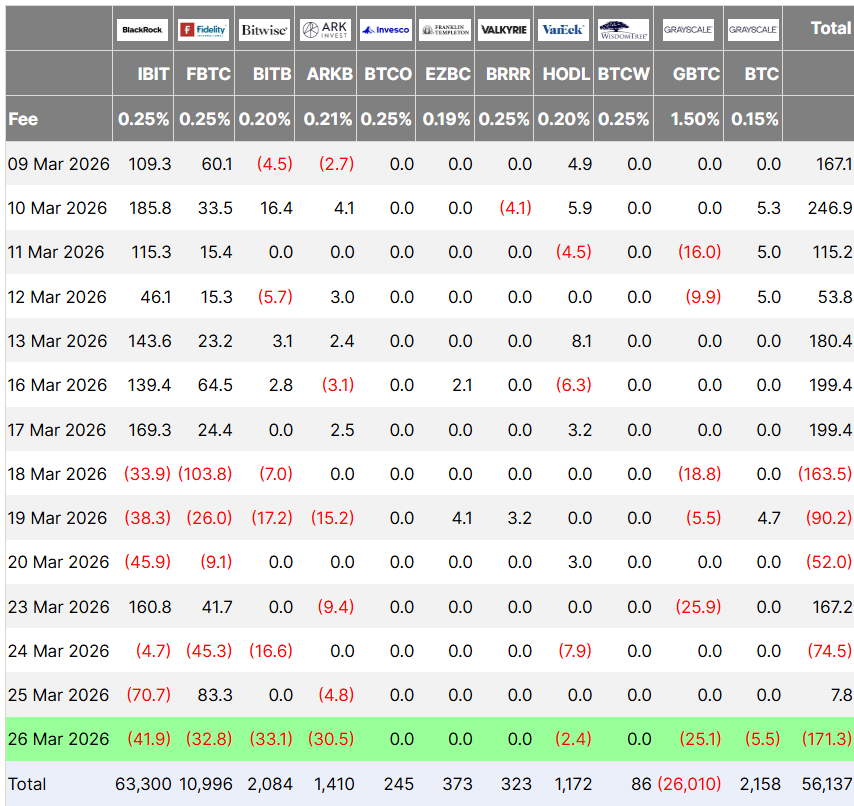 美国现货比特币交易所交易基金周四录得1.71亿美元资金流出,创下自3月3日流出3.48亿美元以来单日赎回规模新高。