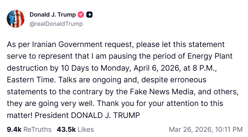 周四,美国总统唐纳德·特朗普宣布将伊朗能源基础设施停火期延长10天至4月6日,理由是谈判正在建设性推进。