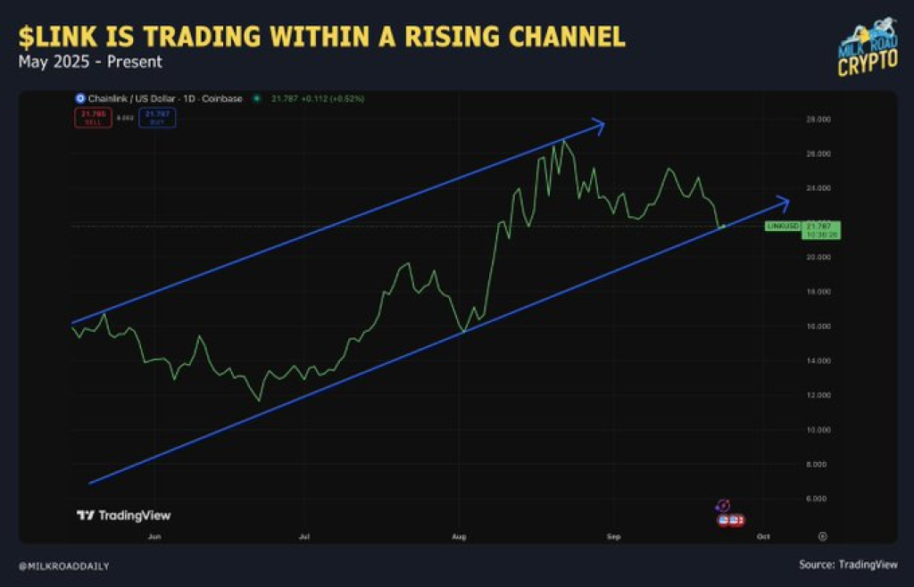 最新行情图表显示,LINK价格正悬于这一关键支撑位上方。截至撰稿时,其交易价格约为21.30美元,几乎精确落在主导整个上涨周期的趋势线下轨。
