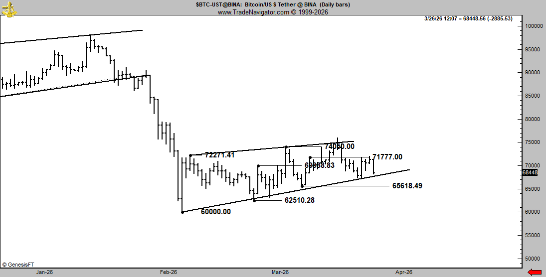 在更长的时间框架上,市场参与者关注的是比特币在2026年形成的第二个看跌旗形结构可能导致看跌支撑位失守。
