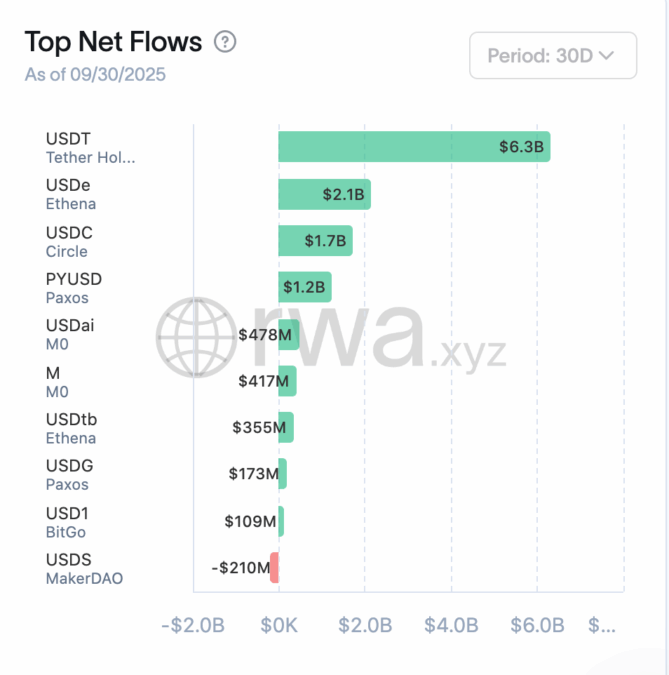 除监管角力外,rwa.xyz最新数据显示稳定币流动性出现变化。过去30天内,Tether(USDT)以63亿美元净流入领跑,Ethena的USDe以21亿美元紧随其后,Circle的USDC增加17亿美元,Paxos的PYUSD也获得12亿美元流入。
