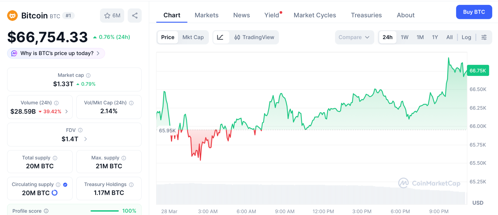 比特币现价66,754美元。巨鲸在一个月内买入6.1万枚BTC,证明买入阶段仍在活跃。