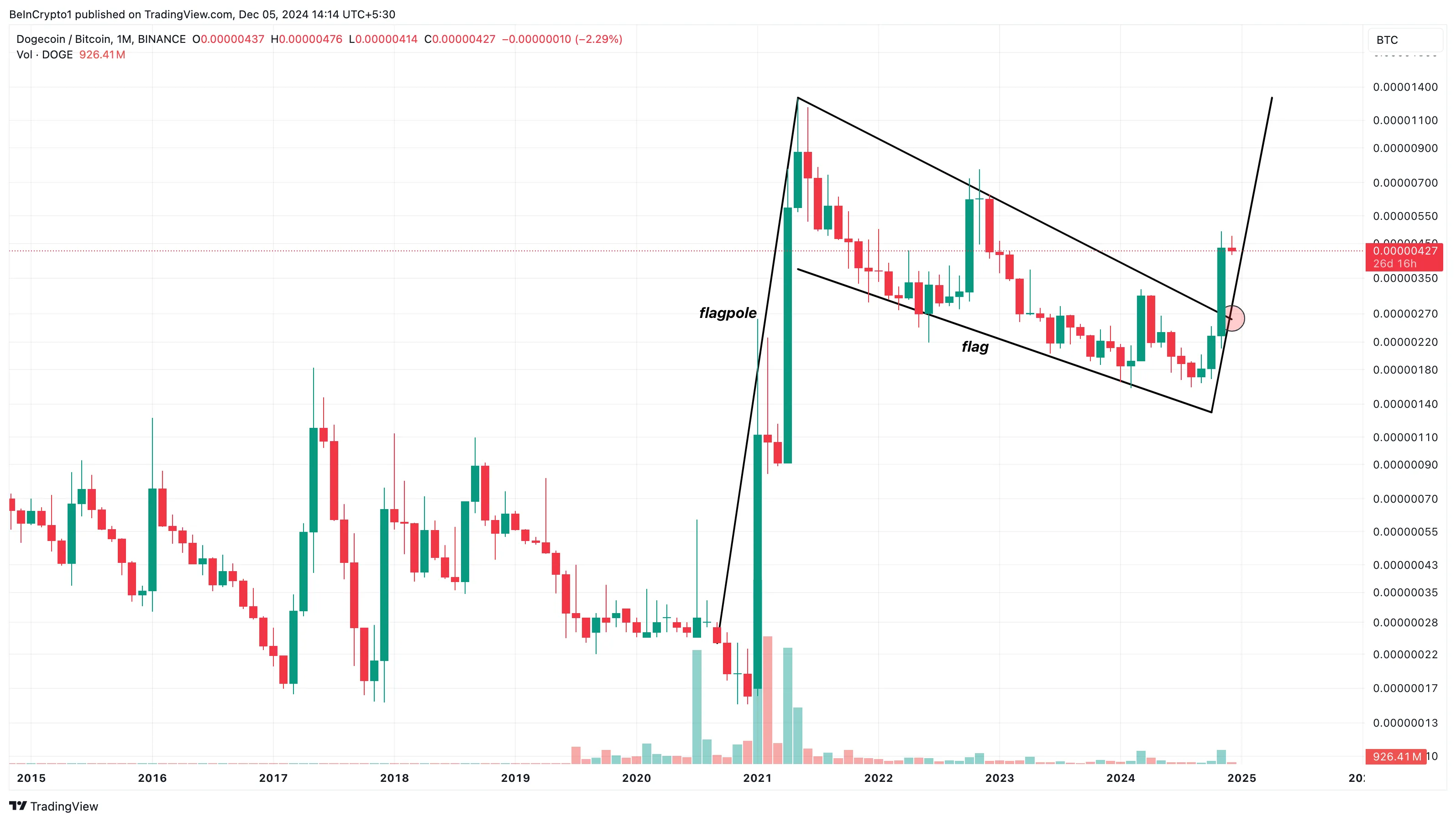 DOGE/BTC走势图显示出一个牛市旗形正在形成。牛市旗形是上升趋势中的经典延续形态,其特征是短暂的向下盘整期,随后出现价格急剧上涨。