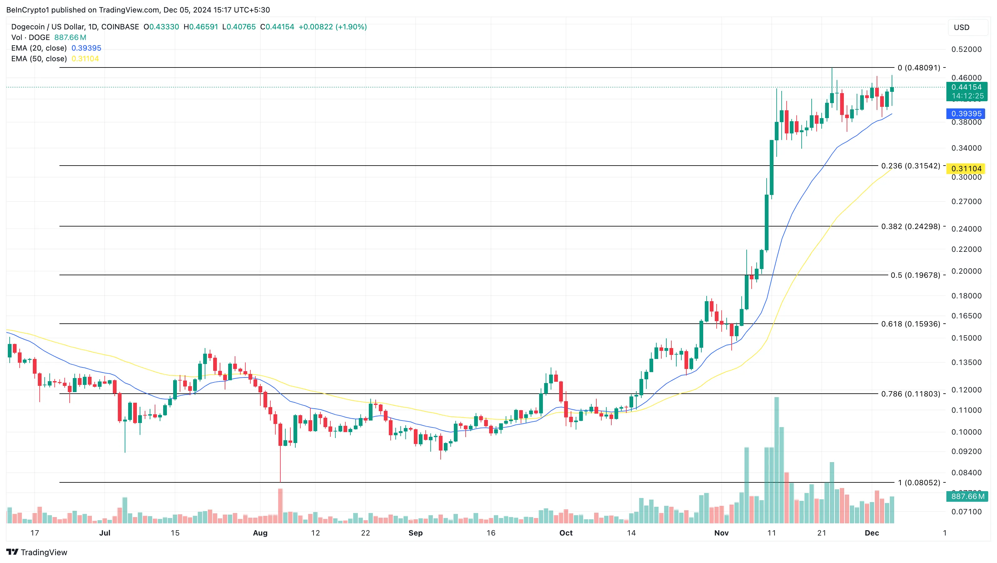 截至发稿时,狗狗币价格为0.44美元,距离其历史最高点还有40%的差距。然而,鉴于当前的市场前景,这一加密货币有可能突破这一水平。