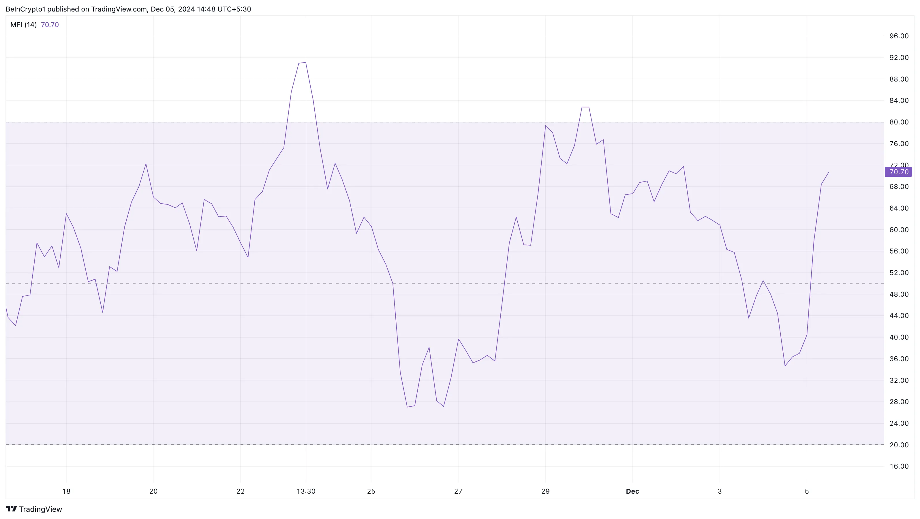 此外,4小时DOGE/USD走势图进一步强化了看涨前景,资金流动指数(MFI)攀升至70.70。MFI衡量流入加密货币的资金量,为市场动能提供洞察。