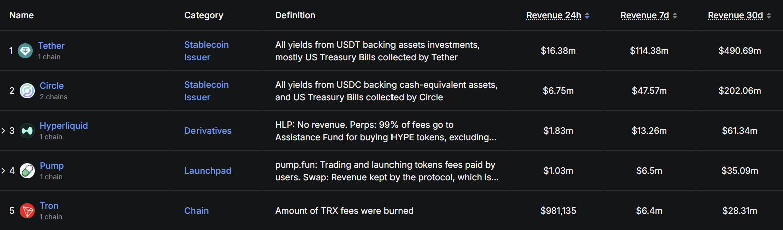 Hyperliquid的排名反映了其作为主导性去中心化永续合约交易所的地位——其平台交易费24小时收入达183万美元。只有Tether和Circle——两家商业模式结构完全不同的稳定币发行商——收入更高。以仅11名团队成员且无风险投资代币解锁实现这一排名,代表了加密货币领域资本效率最高的收入案例之一。