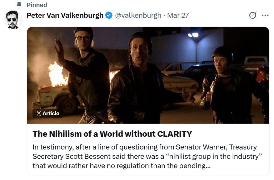在上周五发布的X推文中,瓦尔肯伯格提出,若为追求“短期商业利益”和“当权者的持续善意”而拒绝在《CLARITY法案》和《区块链监管确定性法案》等立法中纳入开发者保护条款,可能导致行业面临“严峻”前景。