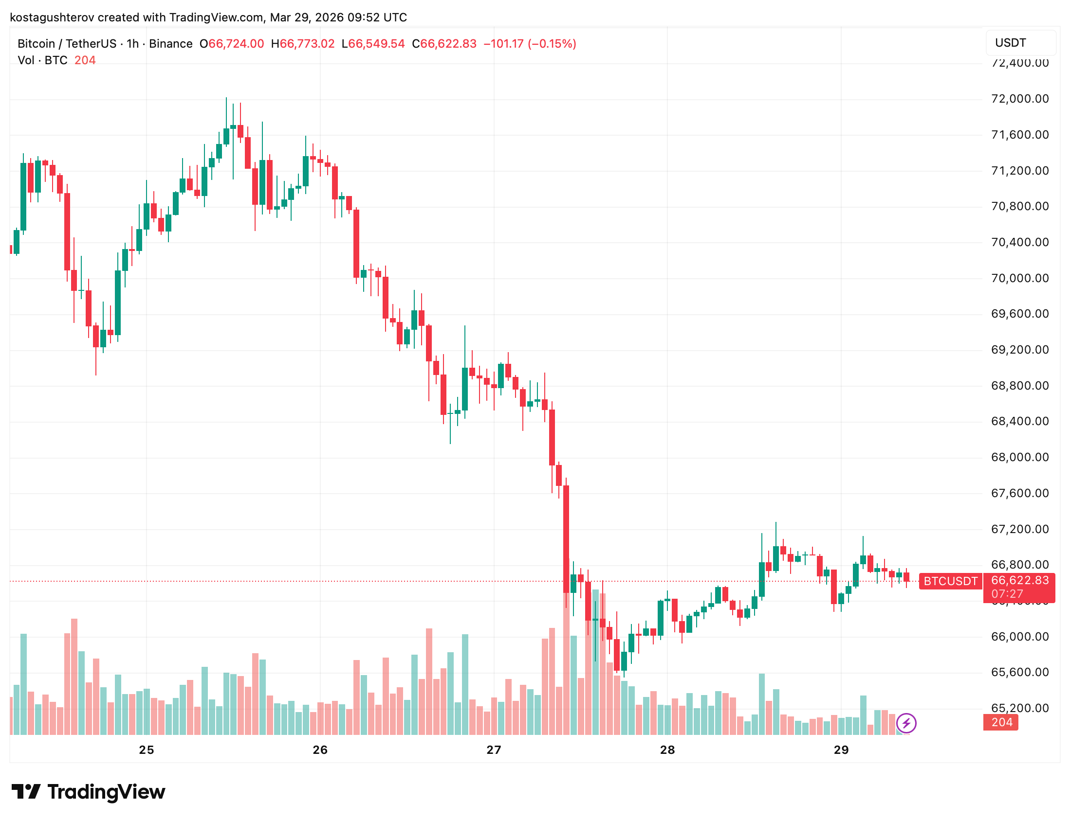 在币安的一小时图表上,比特币于3月25日触及近71,750美元,在3月26日至27日期间大幅抛售至65,500美元附近的低点,随后部分反弹,并在3月28日至29日期间于66,000至67,000美元区间内进行盘整。