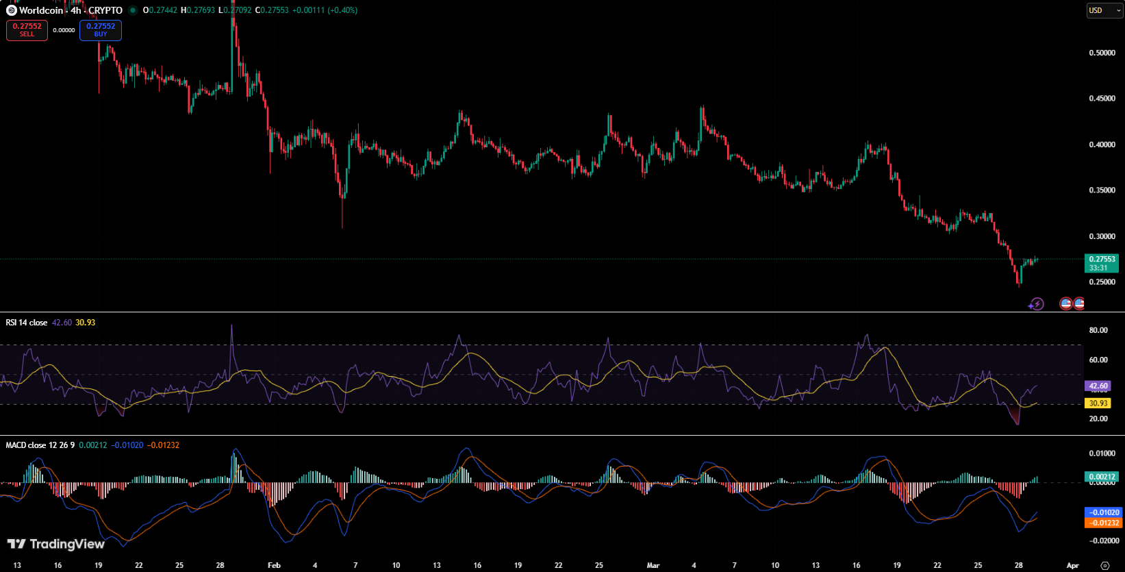 在 4 小时图上,WLD 自 1 月中旬价格高于 0.45 美元以来,一直处于明确的下行趋势中。下跌过程有序但持续,最猛烈的抛售阶段发生在 3 月的最后两周——价格跌破了 0.30 美元的支撑位,并短暂触及 0.25 美元区域,创下数月新低。