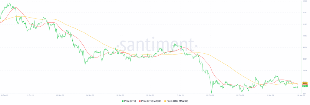 短期比特币持有者面临亏损,其MVRV比率接近0.77,反映出近期买家的持续压力。比特币保持看跌结构,呈现更低的高点、出现死亡交叉且价格低于200日均线。BTC在65,000至72,000美元区间内盘整,67,000美元支撑位与72,000美元阻力位主导短期走势。