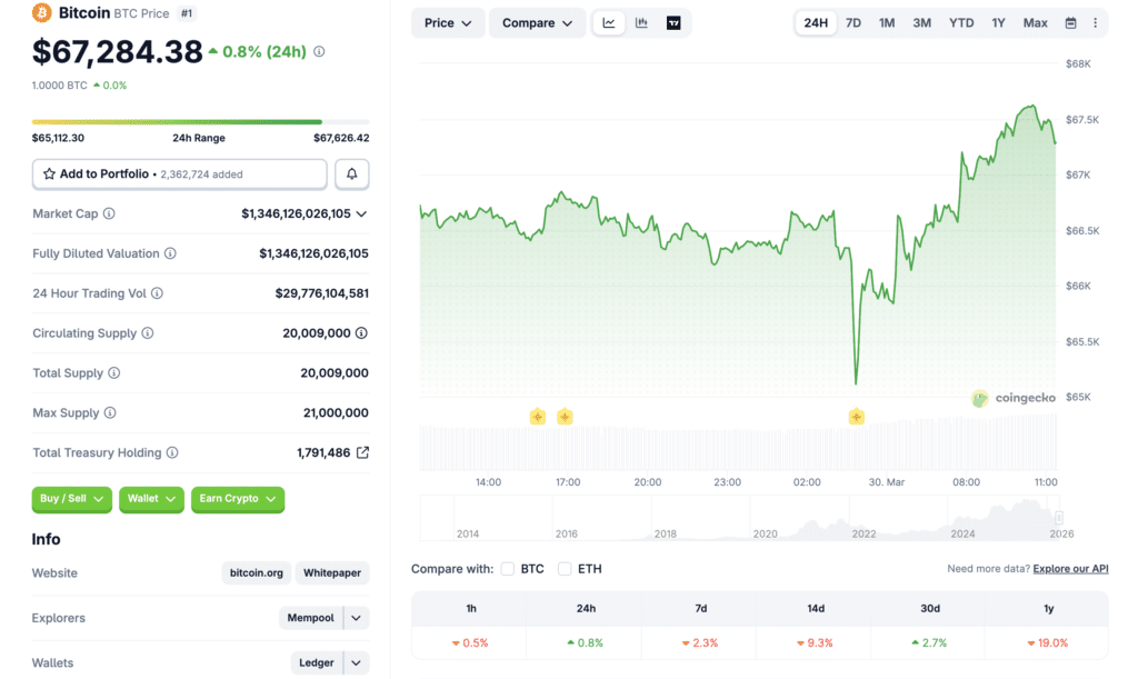 当前比特币交易价格略低于67,404.87美元,过去24小时内价格小幅上升,供应量指标接近2000万BTC的流通总量。多方指出流动性改善和近期价格回升,但基本面的不确定性依然存在。