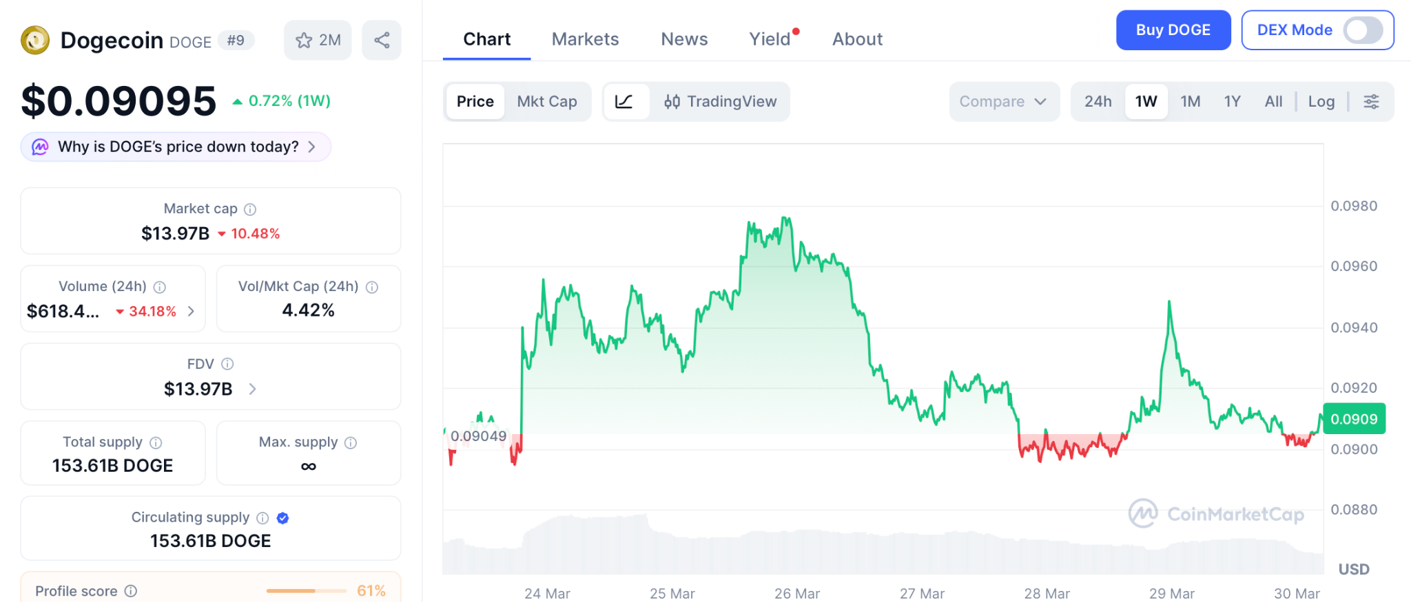 根据CoinMarketCap数据,狗狗币交易价格接近0.09美元,市场情绪看跌,所有三条主要EMA均位于当前价格上方。