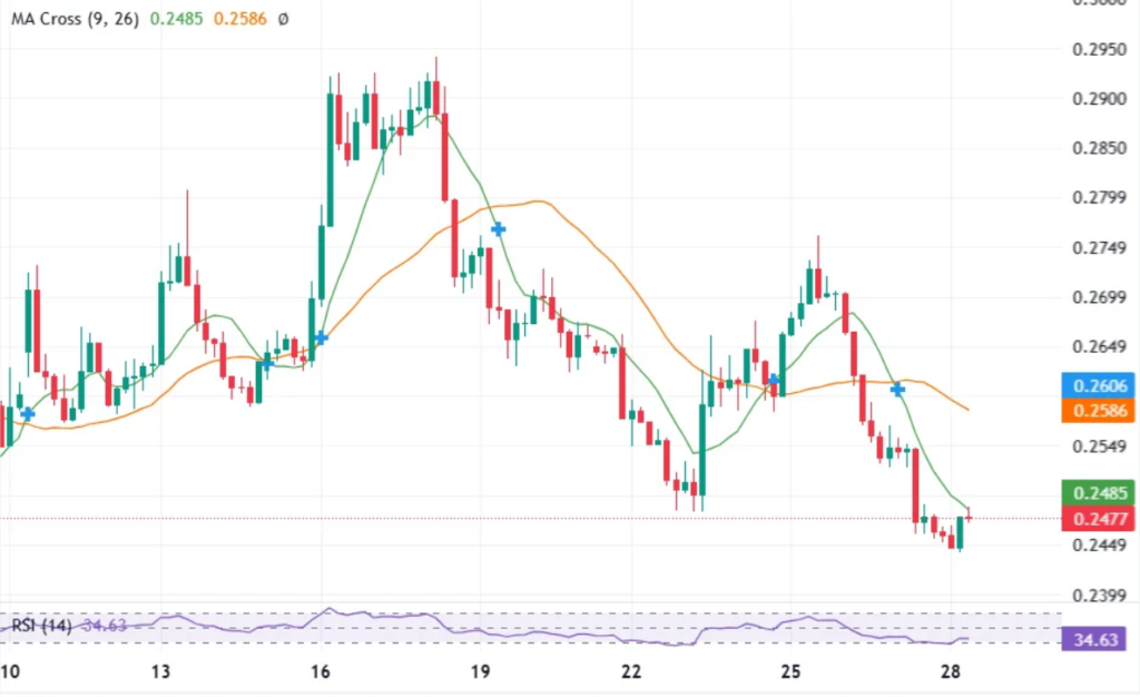 卡尔达诺自近期约0.25美元的高点回落后,于日内较低水平窄幅震荡。因此,当前的价格走势反映了市场的犹豫不决,买方难以重获主导权。交易量亦有所下降,表明在此阶段的参与度降低。