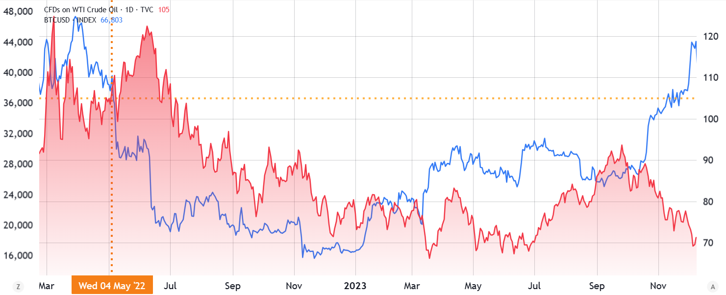 其他因素,如2014年2月门头沟交易所的清算以及2022年5月Terra-Luna生态系统的崩溃,很可能导致了那些长期的熊市。因此,将比特币暴跌归因于某个任意的油价门槛似乎有些牵强。