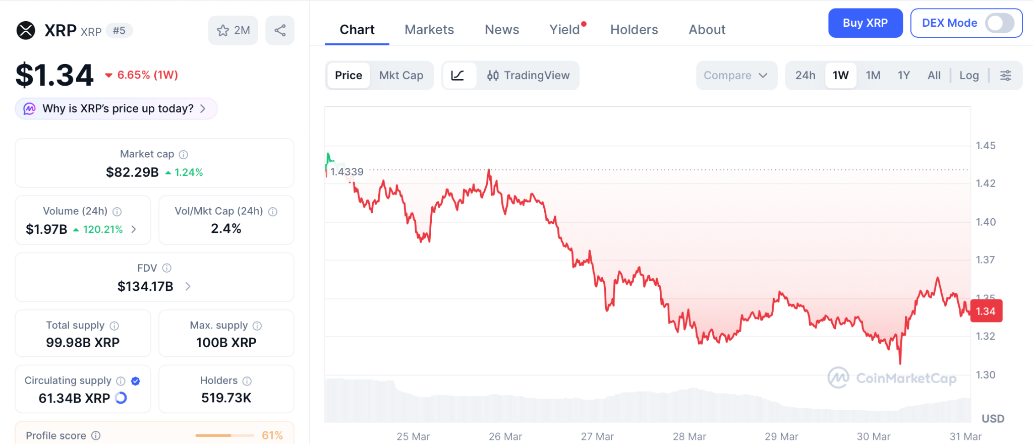 根据CoinMarketCap数据,瑞波币交易价格为1.34美元,随着每周ETF流入957万美元,其价格正在盘整,这证实了机构兴趣的增长。