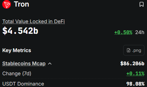 稳定币活动持续强劲。波场网络稳定币市值超过860亿美元,其中USDT占据主导。这保持了流动性活跃度,支撑着持续的交易流。