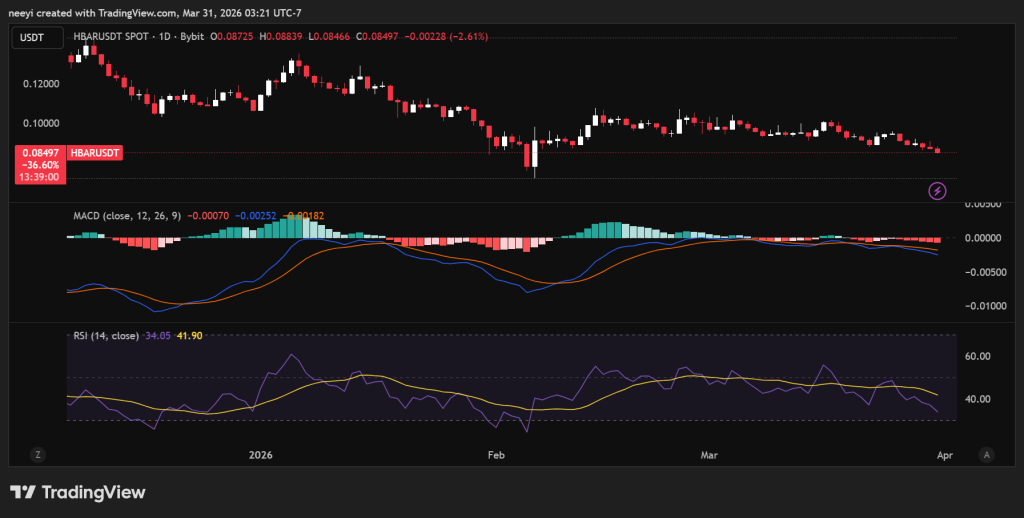 过去一个月描绘了一条清晰的路径:Hedera从三月上旬约0.10美元的水平下滑至目前的0.084美元左右,期间多次未能守住较高价位,并逐渐向更低的区域推进。