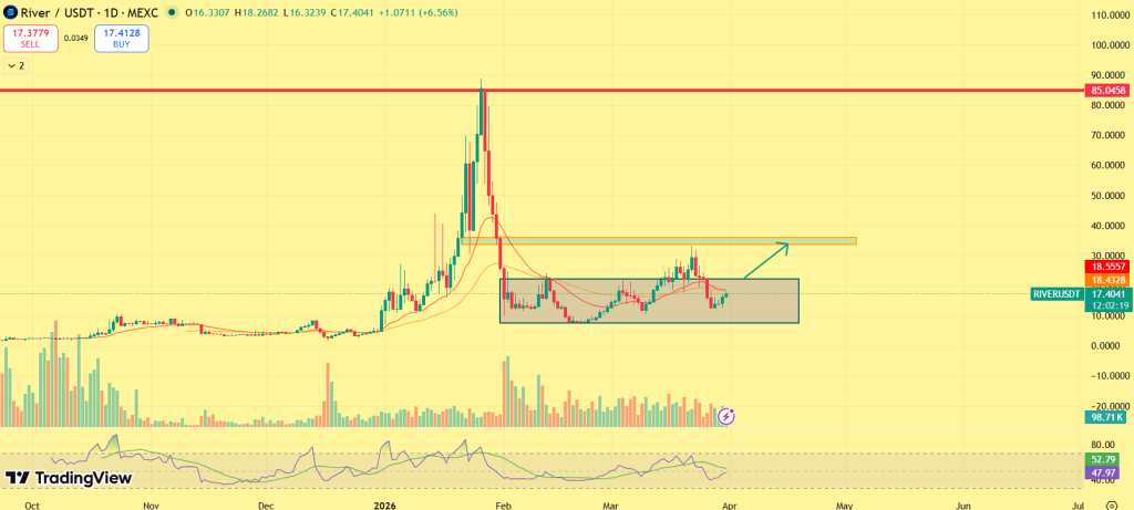过去几周,价格在稳固的支撑基础和区间上沿附近的阻力位之间波动。最近的上涨将RIVER推回至该阻力区,但尚未突破该水平,市场仍处于受控的整固阶段。