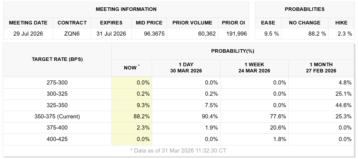 过去一周,比特币价格展现韧性,始终保持在66,000美元上方,而标普500指数周一暴跌至七个月低点。周五原油价格突破100美元并引发市场谨慎情绪。过去一个月,由于燃料价格压力推高通胀,市场对美国货币政策宽松的预期急剧下降。
