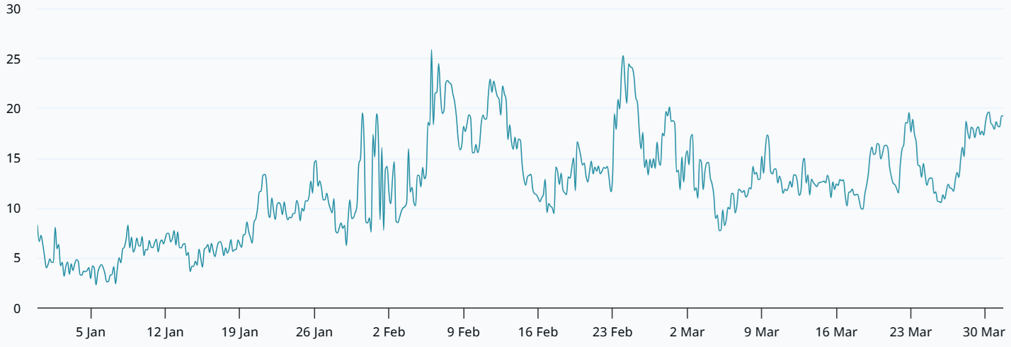 周二,比特币看跌期权相较看涨期权的溢价达到17%。这一水平通常与市场极度担忧价格下跌相关。平衡市场预期的溢价区间为-6%至+6%,最近一次出现是在一月中旬。尽管比特币自2026年初至今已下跌23%,但鲸鱼和做市商显然对持有下行风险感到不安。
