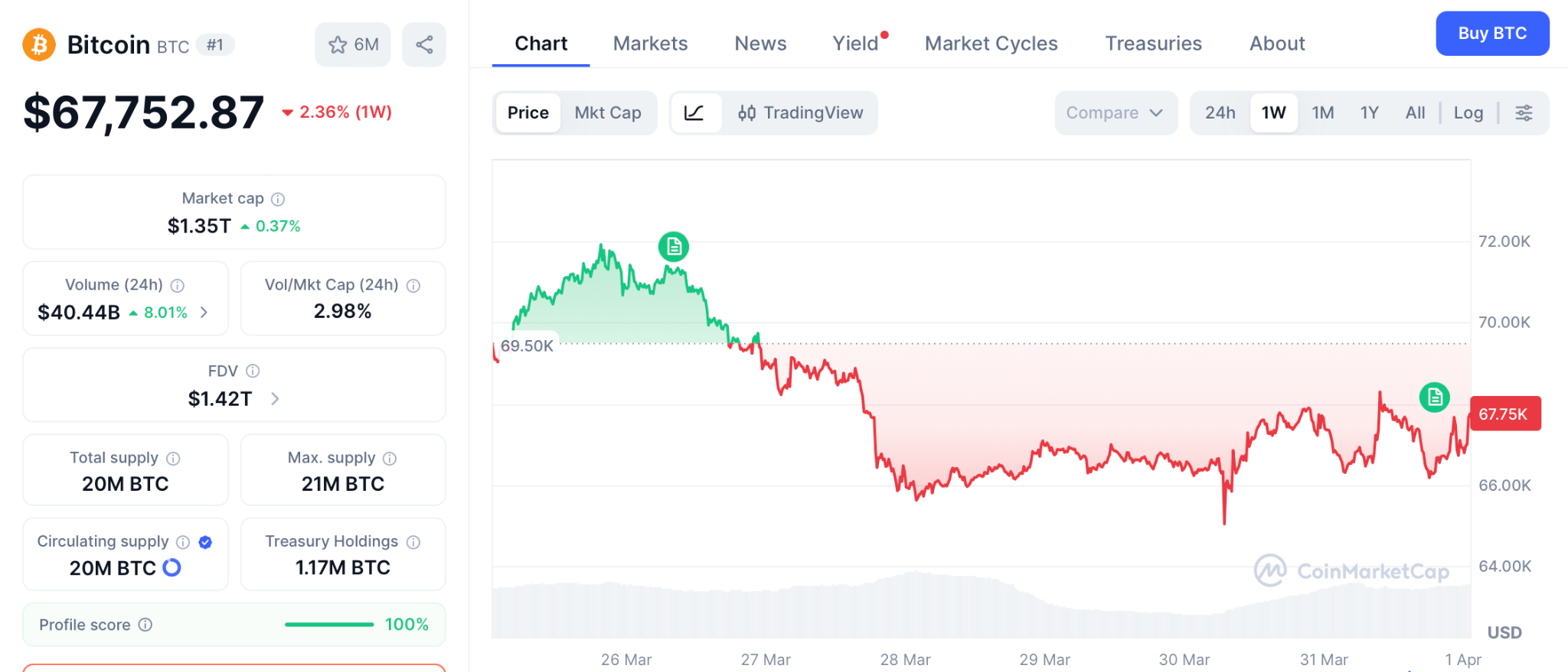 据CoinMarketCap数据,BTC在3月31日交易价格接近67,752美元,较高点下跌47%。ETF买入100%的新增供应证明了需求的永久性。