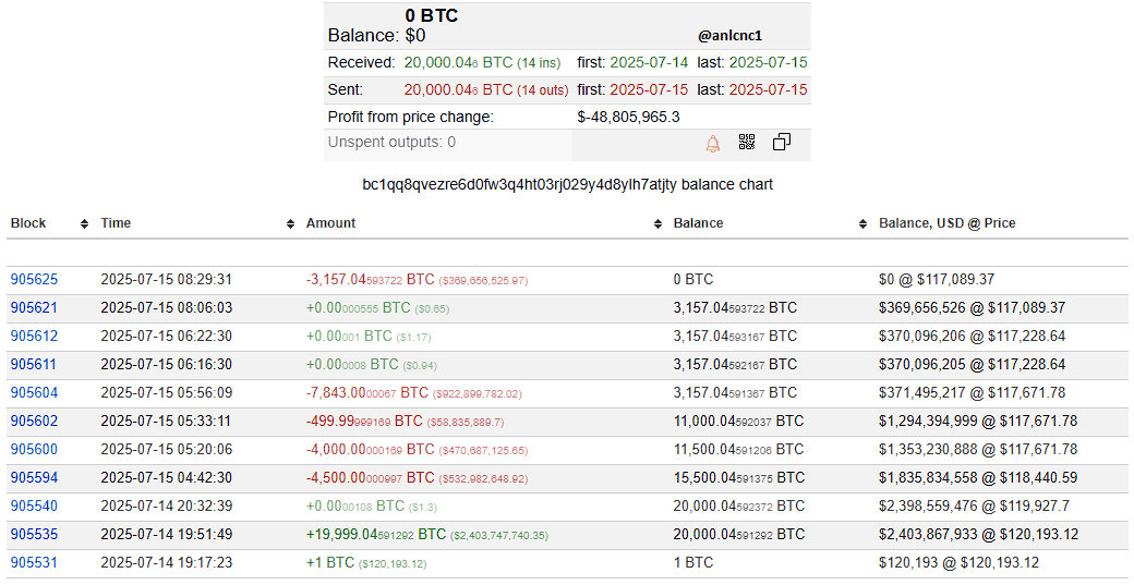 警告很快应验:巨鲸首先将BTC集中至多个钱包,次日凌晨便启动抛售。这些资产被转移至Galaxy Digital,随后又被转入ByBit和Binance等交易所,首批16,000枚BTC的抛售就此展开。