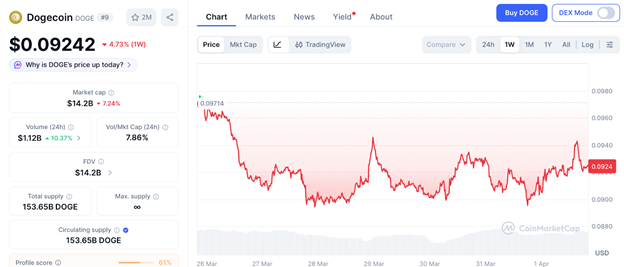 根据数据显示,狗狗币在3月25日至27日期间从$0.097跌至$0.089,随后于4月1日交易于$0.092附近。