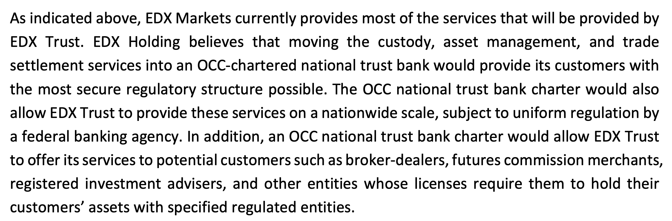 该拟议实体名为EDX信托,将以非存款类全国性银行的形式运营,将托管与结算功能同交易分离,同时继续通过EDX现有平台进行订单匹配。该公司在申请文件中表示,这一模式旨在应对加密市场中常见的结构风险,即交易、托管与经纪业务通常集中于单一平台,可能引发利益冲突与单点故障。