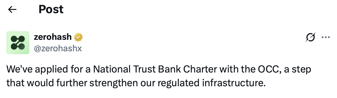 此次申请正值加密及金融企业日益寻求全国性信托银行牌照,以期在联邦监管下拓展机构服务之际。本月初,区块链基础设施公司Zerohash亦申请美国全国性信托银行牌照,以扩大面向银行、经纪商及金融科技公司的稳定币与托管服务。