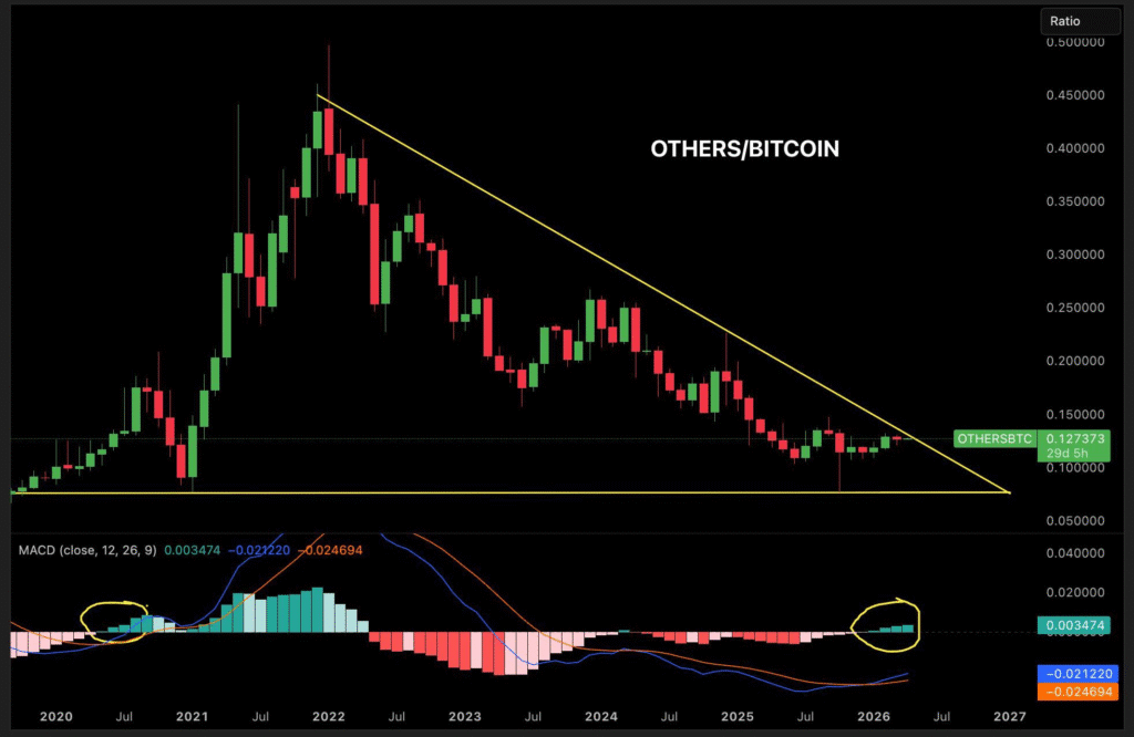据Ash Crypto分析,山寨币季节信号自2020年以来首次重现。ALT/BTC比率已连续出现四个MACD绿色柱状图,此为罕见的看涨信号。历史数据显示,此形态出现后三个月内山寨币普遍上涨60%。当前数据显示OTHERS/BTC接近0.127,且动能转为正向。