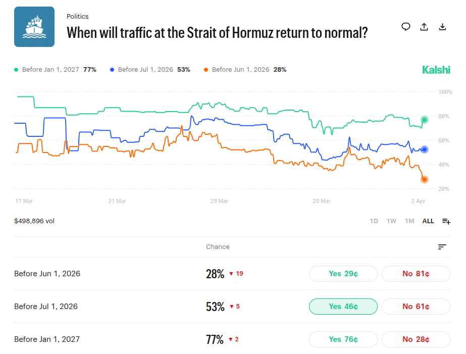 交易资讯平台《科比西通讯》指出,若油价维持当前水平两个月,美国通胀率可能触及3.6%,"这将是2023年9月以来的最高通胀水平"。预测平台Kalshi数据显示市场对今年原油运输恢复"正常"的预期正在下降。