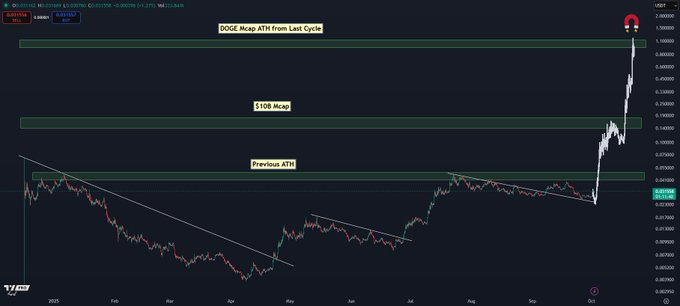 百亿美元市值关口经历短期整固后成功突破,现已转化为潜在支撑区域。上个周期狗狗币的市值峰值成为心理参照点,在缺乏上方技术阻力的情况下,市场注意力愈发聚焦象征性的1美元目标。