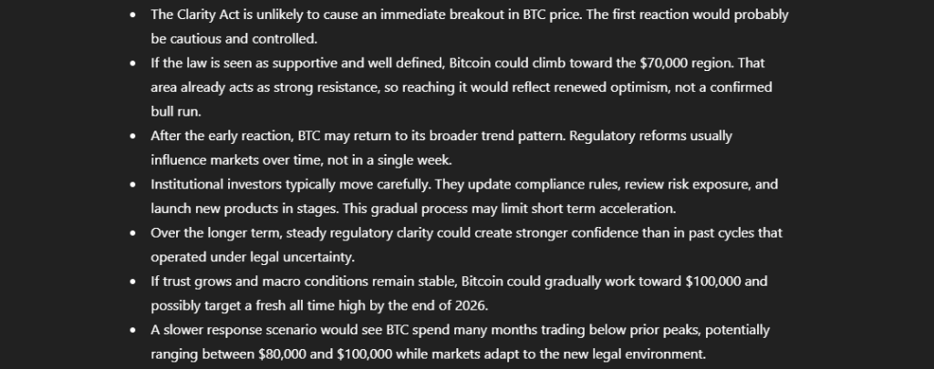预计该法案不会立即引发价格突破。市场的初步反应可能较为审慎。若投资者视该法案为积极明确的信号,比特币价格或可朝着70,000美元区域进行释压性反弹。该区域本就是重要阻力位,因此向上突破将反映市场情绪改善,而非趋势完全逆转。