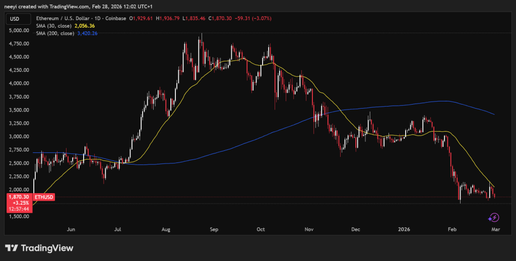 以太坊目前交易于30日简单移动平均线(约2,088美元)下方,并远低于200日简单移动平均线(约3,434美元)。相对强弱指数约39,显示其动能与BTC同样疲软。