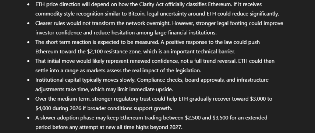 未来数月内,ETH价格可能在2026年逐步回升至3,000至4,000美元区间。市场情绪的普遍转变有望推动其在2027年乃至之后超越前高。在监管变化被市场消化期间,以太坊或将在2,500至3,500美元区间内持续整固。