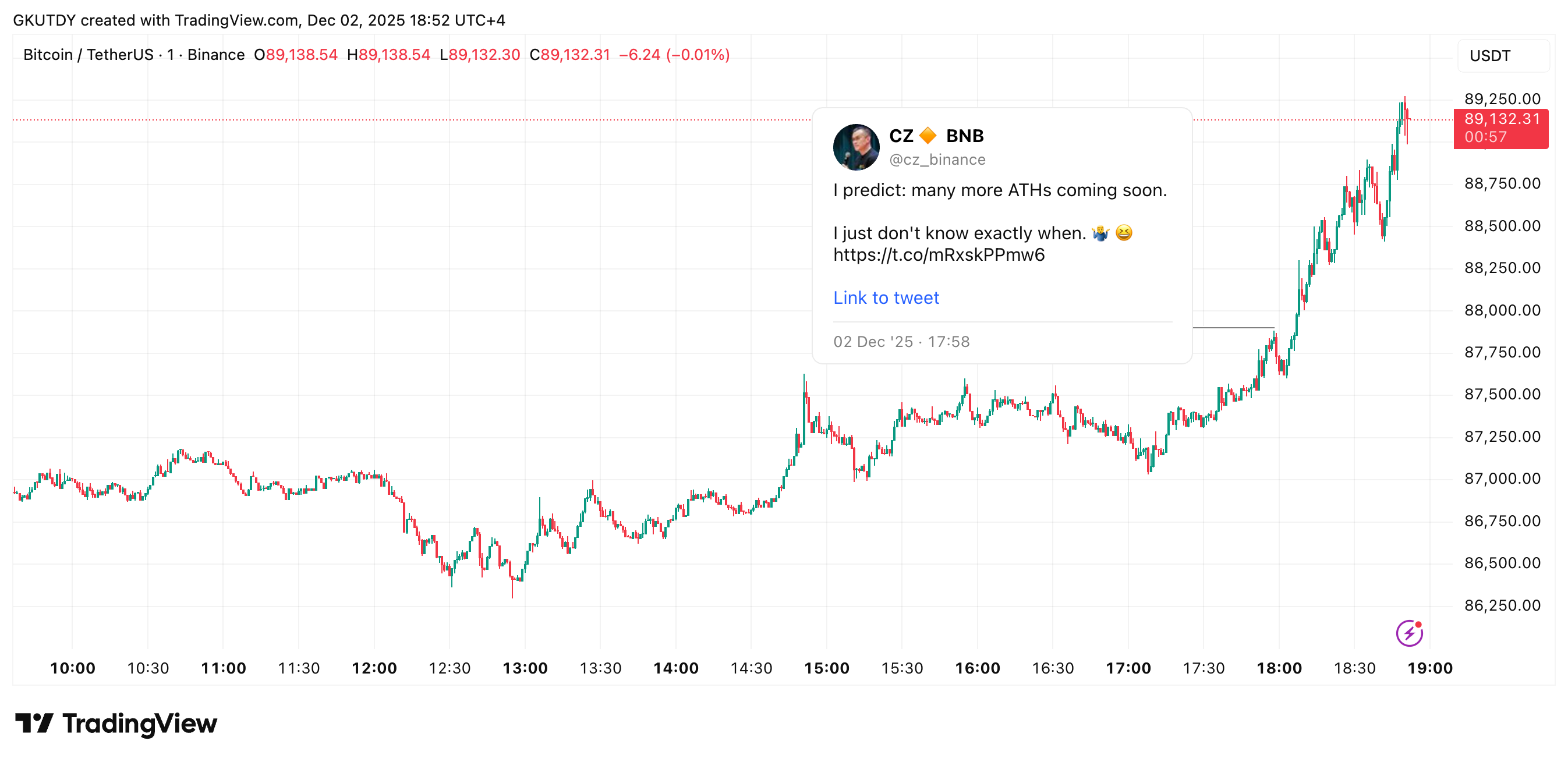 比特币在午后飙升至88,000美元关口,为币安创始人赵长鹏(网络昵称CZ)出人意料的表态提供了绝佳背景。在一篇耐人寻味的推文中,CZ宣称"更多历史新高即将到来",尽管他无法给出具体时间表。