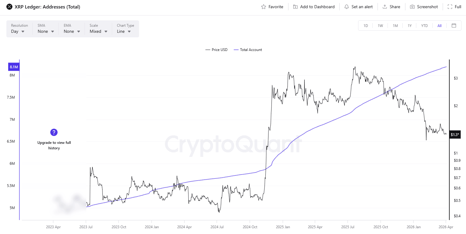 据链上分析平台CryptoQuant数据显示,截至2026年4月2日,XRP账本(XRPL)总地址数达8,189,798个,较年初的7,921,350个实现增长。这标志着该网络在三个月内净地址数增长3.39%,创下历史新高。