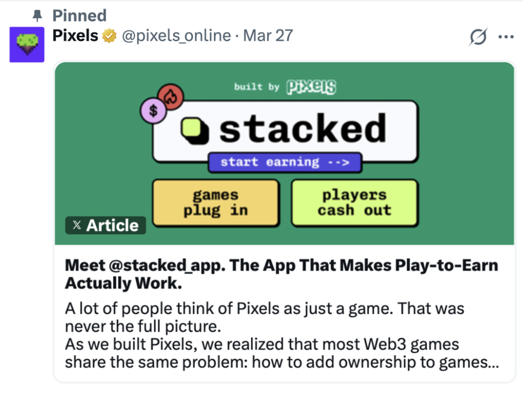 Pixels表示,市场“长期追求”可持续的边玩边赚模式,而Stacked通过将一切功能整合至单一应用,使玩家无需在多钱包或多平台间周旋即可获取收益。创始人Luke Barwikowski强调,该应用旨在将奖励重新分配给用户而非平台。初期将聚焦于$PIXEL生态游戏,包括Pixels、Pixels Dungeons、Sleepagotchi和Chubkins,未来或将向更多游戏开放。“随着系统信心的建立,我们将加速用户获取,更积极地拓展Stacked,并向更多B2B合作伙伴敞开大门。”