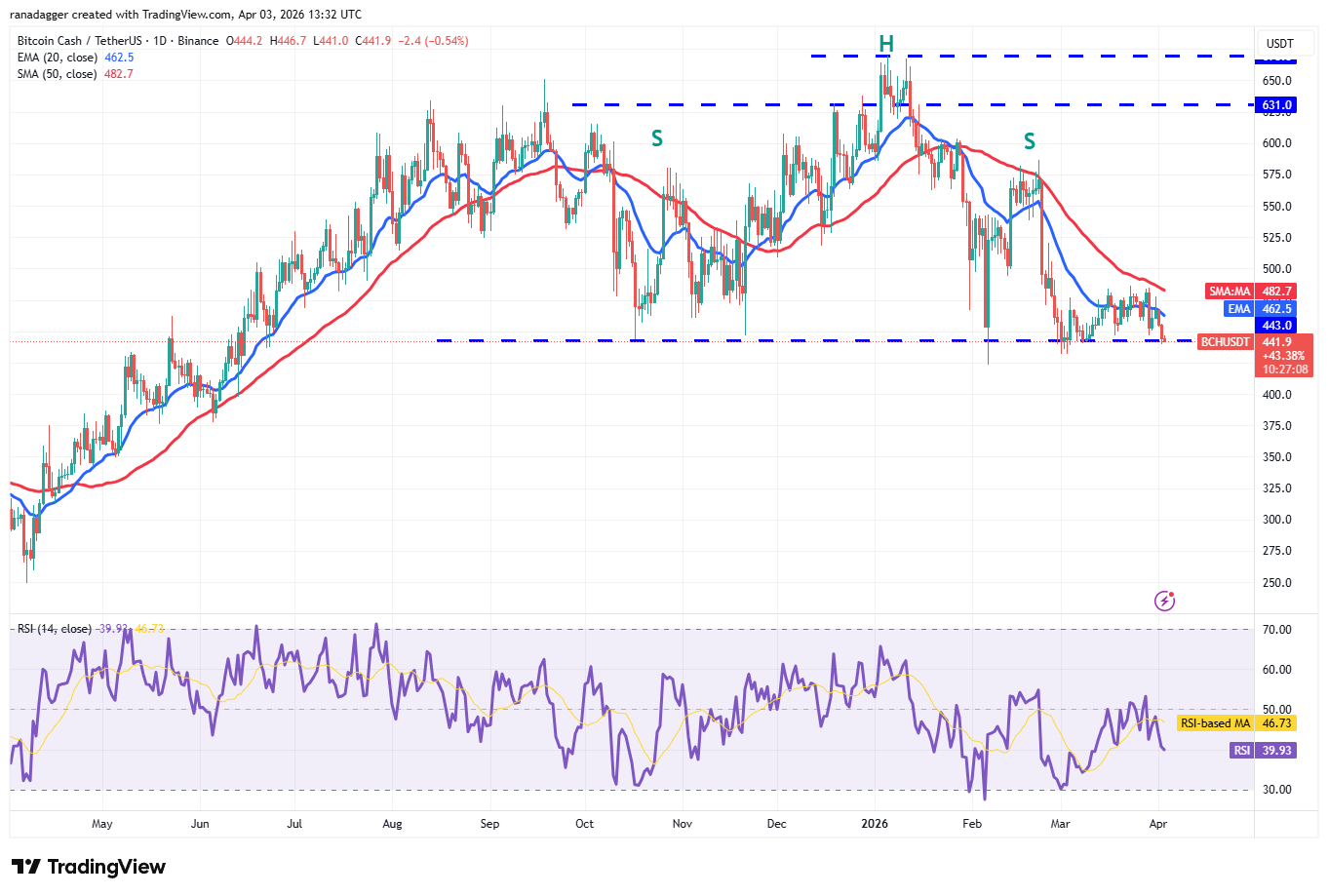 任何从443美元展开的反弹都可能面临移动平均线处的抛售。若BCH价格从移动平均线急剧回落,将增加跌破443美元支撑的可能性。若此情形发生,BCH/USDT交易对将完成看跌的头肩顶形态,随后可能暴跌至375美元。相反,若收盘价站上486美元,则表明多头重回战场,该交易对可能跃升至520至540美元区间。