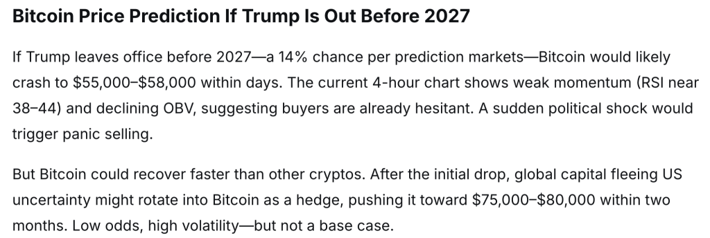 当前加密货币领域流传着一个有趣的假设:如果唐纳德·特朗普在2027年之前离任会怎样?这并非最可能的结果,但预测市场给出的概率约为14%。为了探讨这可能对市场意味着什么,我们咨询了DeepSeek AI。