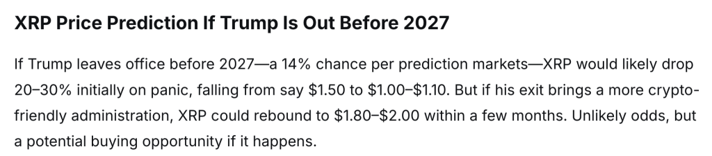 如果特朗普提前离任,XRP几乎可能立即下跌20%至30%。以近期价位为基础,这可能会使其跌至1.00美元至1.10美元左右。恐慌性抛售和市场信心不足可能放大这一跌幅。