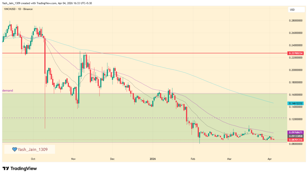1inch价格的日线图显示出一段长期的停滞期,价格被限制在一个明确的水平绿色箱体内。自2月初以来,这个需求区一直是持续的基底,代币在整个第一季度末持续横盘整理。尽管近几个月缺乏显著的波动,但当前结构表明市场正处于深度积累阶段,等待一个突破催化剂来结束更低高点趋势。