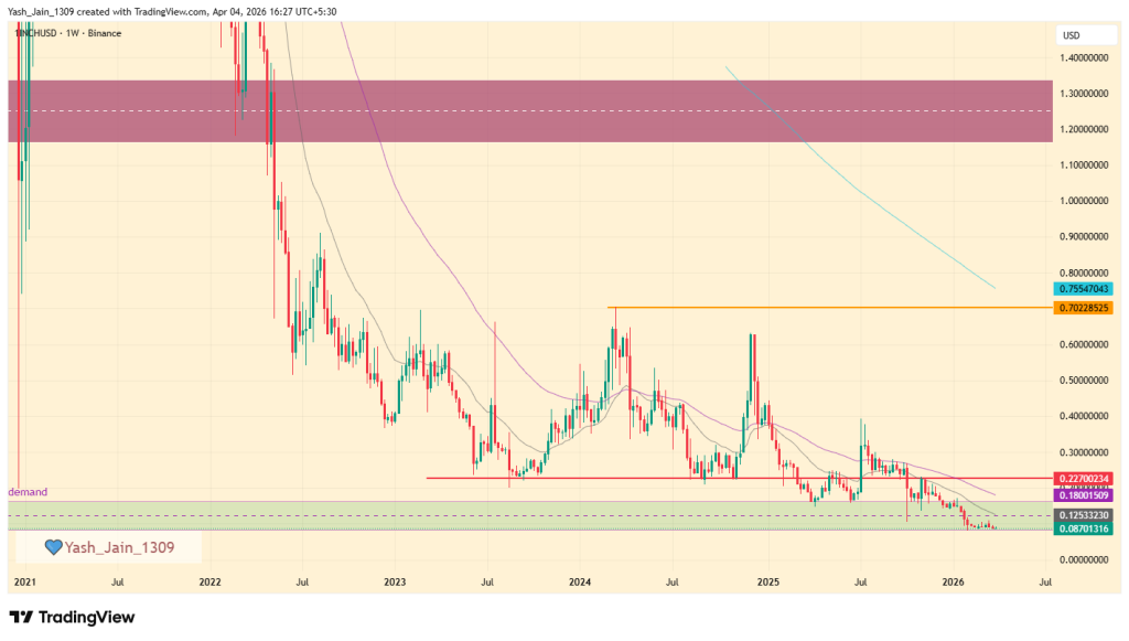 1inch价格的周线图显示,其正处于一个主要的技术十字路口,价格已回落至绝对的历史底部。这个长期积累区间至关重要;然而,该代币在整个2025年和2026年初一直受到持续的抛售压力压制。