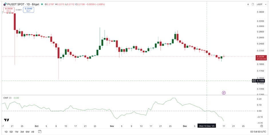 当前0.20美元是最关键价位。Pi币虽小幅突破该水平,但尚未形成坚实支撑。