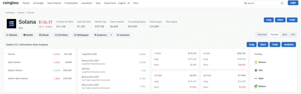 - Solana 交易价格约为 127.4 美元,强劲的现货和期货交易量表明市场参与活跃。流动性仍集中在主要交易所,支撑短期价格稳定。